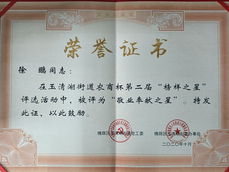 為進一步培育和踐行社會主義價值觀,弘揚正氣、傳承美德,發(fā)揮先進典型在公民道德建設(shè)中的示范引領(lǐng)作用,濟南市槐蔭區(qū)玉清湖街道黨工委通過廣泛發(fā)動,經(jīng)過轄區(qū)、駐地企業(yè)的積極推薦和參選,我公司徐鵬總經(jīng)理在玉清湖街道農(nóng)商杯第二屆“榜樣之星”評選活動中被評為“敬業(yè)奉獻之星”。